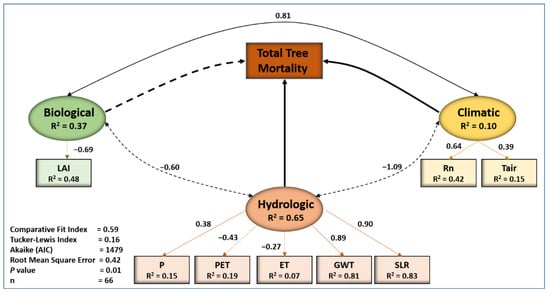 One type of probabilistic model that permits the specification of multiple causal pathways is SEMs (structural equation models) []. A chi-square test is used to assess the validity of the proposed SEM, and the p-value needs to be greater than 0.05 (Shipley, 2016). Measured variables were log-transformed in order to prevent data normality-related errors. The Shapiro–Wilk Univariate normality test and Mardia Multivariate normality test were applied to assess normality and skewness using the MVN package. We built our SEM based on our assumption that the effects of biological (represented by LAI), hydrological (P, PET, ET, GWT, and SLR), and climatic (Rn and Tair) variables impact tree mortality. The SEM was built using the sem() function lavaan package in R [].