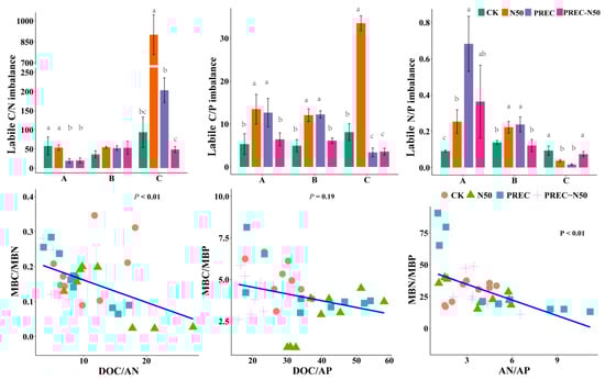 Stoichiometric imbalances between microbes and soil labile resources, and the relationships between microbial stoichiometry and soil labile resource stoichiometry in three soil layers (A: 0–5 cm depth, B: 5–10 cm, C: 10–20 cm) in response to four treatments: control (CK), N addition (N50), precipitation reduction (PREC) and precipitation reduction combined with nitrogen addition (PREC-N50). Values are means ± SE (n = 3). Different lowercase letters indicate significant differences between treatments in the same soil layer.
