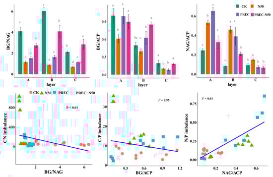 Soil enzymatic stoichiometry and the relationships between enzymatic stoichiometry and stoichiometric imbalances between microbes and soil labile resources in three soil layers (A: 0–5 cm, B: 5–10 cm, C: 10–20 cm depth) in response to four treatments: control (CK), N addition (N50), precipitation reduction (PREC), and precipitation reduction combined with nitrogen addition (PREC-N50). Values are means ± SE (n = 3). Different lowercase letters indicate significant differences between treatments in the same soil layer.