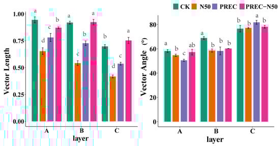 The enzymatic vector length and vector angle in response to four treatments: control (CK), N addition (N50), precipitation reduction (PREC), and precipitation reduction combined with nitrogen addition (PREC-N50). Values are means ± SE (n = 3). Different lowercase letters indicate significant differences between treatments in the same soil layer. Different capital letters A, B, and C represent the soil depth of 0–5cm, 5–10cm, and 10–20cm, respectively.