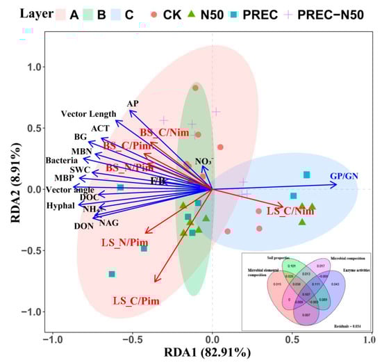 The general linear mixed model (GLMM) for completed randomized split-plot design was used to assess the effects of increased N fertilizer and reduced precipitation on soil chemical properties, microbial characteristics, soil enzyme activities, stoichiometric imbalances, and microbial stoichiometry. The analysis was conducted using the R package “NLME.” Fixed effects included precipitation reduction (PREC), N addition (N50), soil layer (Layer), and their interactions (PREC-N50, PREC × Layer, Layer × N50, PREC-N50 × Layer), while blocks were treated as random effects. When significant effects were found at the 0.05 significance level, multiple comparisons between treatments were conducted using Tukey’s HSD test. To explore the microbial strategies related to stoichiometric imbalances, redundancy analysis (RDA) was performed using the R package “VEGAN” to examine explanatory factors such as soil and microbial chemical concentrations, enzyme activities, and microbial composition (PLFA). Variance partitioning analysis (VPA) was also carried out with the R package “RDACCA.HP” to assess the contribution of these factors in explaining microbial adaptation to nutrient imbalances [].