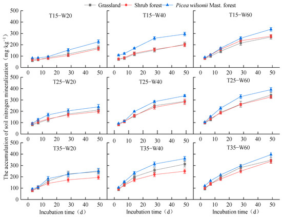 In general, the accumulation of soil nitrogen mineralization in grassland and P. wilsonii Mast. forest was the largest under the T35 temperature treatment and W60 moisture treatment, while that in shrub forest was the largest under the T35 temperature treatment and W40 moisture treatment. With regard to the different vegetation types, the P. wilsonii Mast. forest exhibited the highest accumulation of soil nitrogen mineralization.