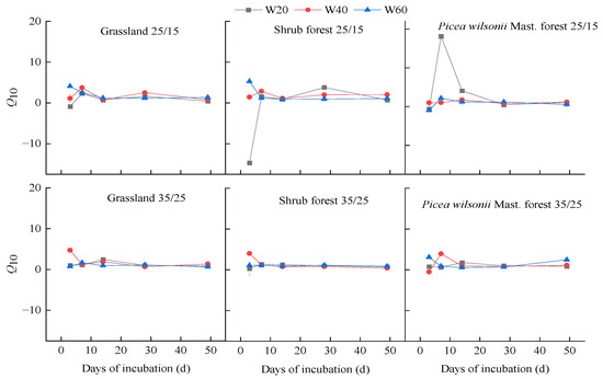 The Q10 of the three vegetation types increased first and then decreased with increasing incubation time under the T25 and T15 temperature treatment and the T35 and T25 temperature treatment. The peak time of Q10 in grassland and shrub forest decreased from the 7th day to the 3rd day with increasing soil water content under the T25 temperature treatment and T15 temperature treatment, while the peak time of Q10 in P. wilsonii Mast. forest did not change significantly, but the Q10 of P. wilsonii Mast. forest showed a negative value on the 3rd day. The range of Q10 of the three vegetation types was 0.66–4.73, 0.32–4.03, and −0.53–3.93, respectively. The peak time of Q10 of the three vegetation types was curtailed from 7d to 3d, from 7d to 3d, and from 14d to 3d under the T35 temperature treatment and T25 temperature treatment, respectively. The range of Q10 of the three vegetation types was −0.87–4.10, −14.72–5.29, and −0.99–18.14, respectively (Figure 3).