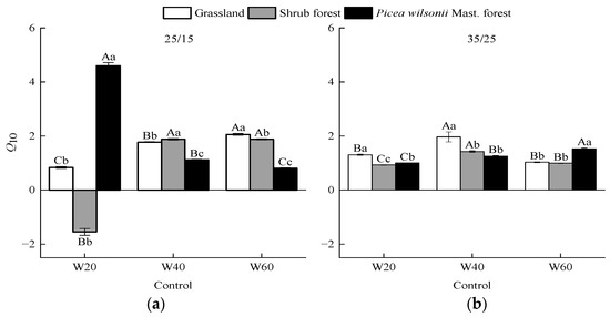 Temperature sensitivity of soil nitrogen net mineralization rate Q10. Note: (b) 35/25 represents the temperature sensitivity coefficient Q10 under 35 °C and 25 °C temperature treatments; (a) 25/15 represents the temperature sensitivity coefficient Q10 under 25 °C and 15 °C temperature treatments. W20, W40, and W60 represent 20%, 40%, and 60% of field capacity, respectively. Statistically significant different vegetation types (p < 0.05) are denoted by distinct capital letters. Statistically significant different moisture contents (p < 0.05) are denoted by distinct lowercase letters.