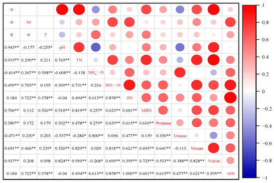 Spearman correlation analysis showed that vegetation types were positively correlated with pH, TN, NO3−-N, MBN, nitrate reductase, and nitrite reductase and negatively correlated with NH4+-N and urease. Soil moisture content was positively correlated with NO3−-N, initial inorganic nitrogen, and AIN. Soil temperature was positively correlated with TN, NH4+-N, and MBN. The cumulative mineralization of soil nitrogen was positively correlated with soil moisture content, NH4+-N, NO3−-N, initial inorganic nitrogen, MBN, proteinase, and nitrate reductase (p < 0.05) (Figure 5).