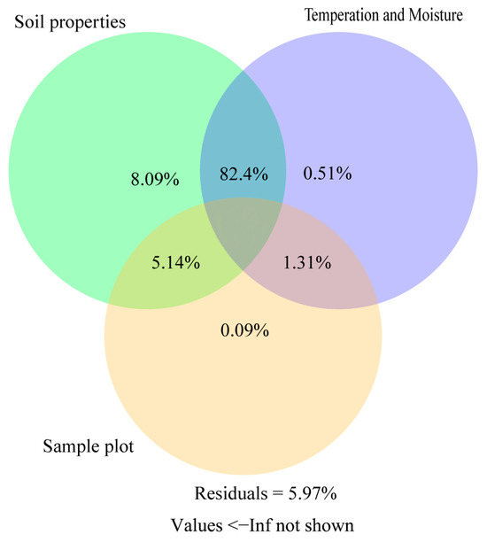 VPA showed that the interaction of soil temperature and soil moisture content, vegetation type, and soil physical and chemical properties explained 100% of the accumulation of soil nitrogen mineralization. The interpretation of the interaction between soil temperature and soil moisture content was 0.51%; the interpretation of the change in soil physical and chemical properties was 8.09%; the interpretation of the change in vegetation type was 0.09%; the interpretation of the interaction between vegetation type, soil temperature, and soil moisture content was 1.31%; the interaction between vegetation type and soil physical and chemical properties was 5.14%; and the interpretation of the interaction between soil physical and chemical properties, soil temperature, and soil moisture content was 82.4% (Figure 6). The change in the accumulation of soil nitrogen mineralization is therefore highly dependent on the interactions among the soil’s physical and chemical properties, soil temperature, and soil moisture content (Figure 6).
