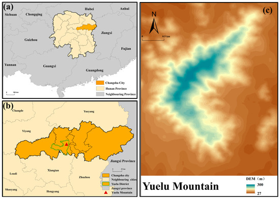Geographical location map of Hunan and Yuelu Mountain. (a) Geographical location of Hunan Province; (b) geographical location of Changsha City; (c) topographic map of Yuelu Mountain.