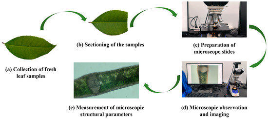In the microscopic observation experiment, for the leaves of each of the seven broadleaf plant species, three leaves were randomly selected from each plant for the experiment. A blade was used to make a cut perpendicular to the main vein at the center of the leaf. Two blades were then placed side by side to cut multiple thin transverse sections of the leaf as thin as possible, which were placed in freshwater. The thinnest sections were selected and carefully positioned on a microscope slide using a fine brush, ensuring their vertical orientation. The leaf structures were observed using an optical microscope (SA3000, Beijing Tech Instrument Co., Ltd., Beijing, China). A digital camera interface attached to the microscope was used to transmit images of the leaf microstructure to a computer. The percentages of spongy mesophyll, palisade cells, epidermis, and intercellular spaces in the leaf samples of each plant species were recorded. The experiment was repeated multiple times, and the average values were calculated. The ratio of spongy mesophyll to palisade cells was expressed as S/P. The specific experimental procedure is illustrated in Figure 2.