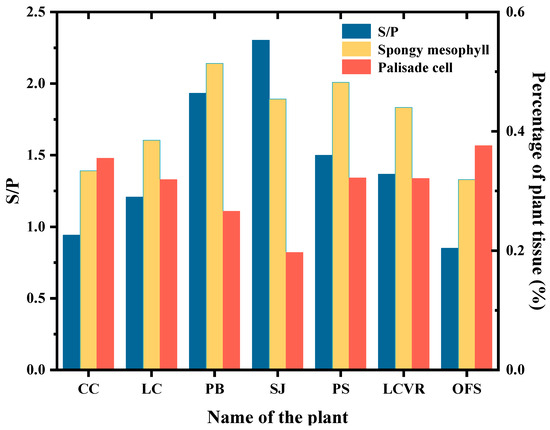 Microscopic experiments were conducted on leaf samples from the seven selected plant species, with results presented in Table 1 and Figure 4. The findings show that the S/P ratios of SJ and PB leaves were significantly higher than those of the other five species. Specifically, the proportion of spongy mesophyll in SJ was more than twice that of palisade cells, and its epidermis was the thinnest, accounting for only 6% of the leaf thickness. The spacing between leaf tissues in SJ reached up to 28.8% of the total leaf thickness. In contrast, the S/P ratios of OFS and CC were less than 1, substantially lower than those of the other species.