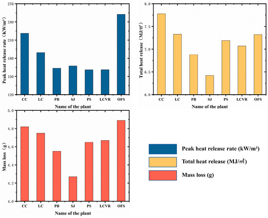 The peak heat release rate, total heat release, and mass loss were selected to quantitatively analyze the combustion performance of each plant species’ leaves. These parameters were used to compare the combustion differences among the species, and the results were plotted in Figure 5.