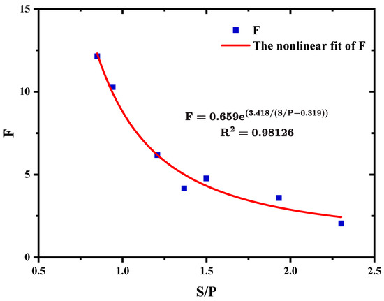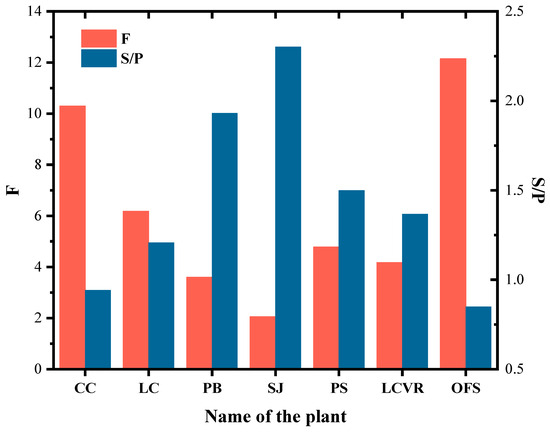 The comprehensive fire risk factor (F) and the ratio of spongy mesophyll to palisade cells (S/P) are plotted as a bar chart, as shown in Figure 6. A negative correlation is observed between the two. F decreases with the increase in S/P, but the decreasing trend gradually slows down, so it is inferred that the two are exponentially correlated.