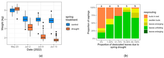 Weight of the pots during the spring treatment for the control saplings and the saplings subjected to drought (a) and proportion of the saplings that had experienced drought in the different resprouting categories after the spring drought, according to the proportion of desiccated leaves (b). The lowercase b denotes a significant difference with the saplings that had zero desiccated leaves.