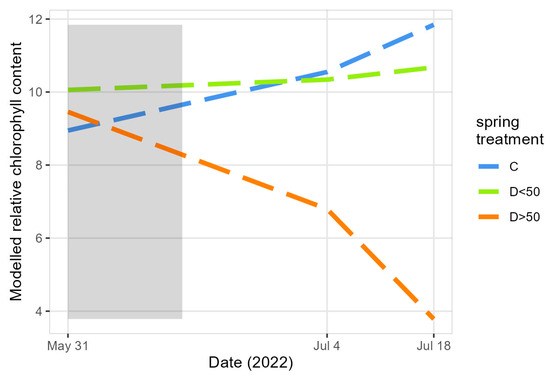 The modeled relative chlorophyll content in the leaves of the saplings at the beginning (May 31) and after (July 4 and 18) the spring treatment. C: controls and D: drought group with less (D<50) or more (D>50) than half of their leaves desiccated due to the spring drought. The spring drought treatment period is indicated in grey.