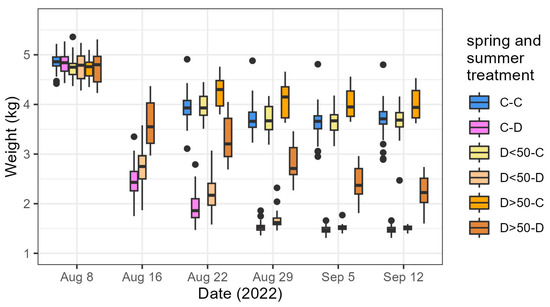 Box plot presenting weight of the pots during the summer drought treatment for the six different combinations of the two consecutive treatments, i.e., C-C: control–control, C-D: control–drought, D<50-C and D<50-D: less than half of leaves desiccated due to the spring drought followed by control or drought, D>50-C and D>50-D: more than half of leaves desiccated due to the spring drought followed by control or drought.