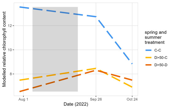 The modeled relative chlorophyll content in the leaves of the saplings before (August 1) and after (September 26 and October 24) the summer treatment. C: control and D: drought group with D>50: more than half of their leaves desiccated due to the spring drought. The summer drought period is indicated in grey. Only treatment groups significantly differing from C-C are shown.