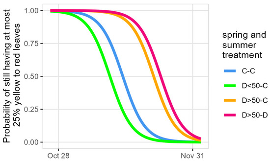 Modeled timing of autumnal leaf decoloration. C: control and D: drought groups with D<50 and D>50: less and more than half of their leaves desiccated due to the spring drought. Only treatment groups significantly differing from C-C are shown.
