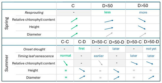 Schematic representation of the results from the modeling of the response variables for the spring and summer treatments. The saplings were in a control (C) or drought group (D) in the spring treatment or in the combined spring and summer treatment (separated by a hyphen). The spring drought caused less than half or more than half of the leaves to desiccate (D<50 or D>50). Italic: response variable specific to either the spring or summer treatment; grey background: not measured; arrows: increase or decrease; equality sign: no change; green: standard group to which the others are compared; blue: significantly different from the standard group; grey: no significant difference with regard to the standard group.