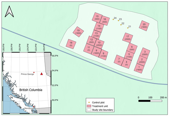 This study was established in 2004 when the spruce saplings were 17 years old. At this time, the stand had a mean density of 2002 broadleaf stems per hectare (SPH) with a standard deviation (SD) of 783 and a mean density of 1151 (SD = 335) spruce SPH (Data not shown). Trembling aspen formed the majority of the broadleaf trees, with smaller amounts of paper birch and black cottonwood (Populus trichocarpa Torr. and Gray). In addition to spruce, relatively low amounts of other conifers were present on the site at the time of study establishment: (i) western redcedar (Thuja plicata Donn ex D. Don); (ii) western hemlock (Tsuga heterophylla (Raf.) Sarg.); (iii) subalpine fir (Abies lasiocarpa (Hook.) Nutt.); and (iv) Douglas-fir (Pseudotsuga menziesii (Mirb.) Franco). These conifers were assumed to have regenerated naturally after harvest. The experimental design consisted of 20 treatment units (TU) distributed throughout the site (Figure 1). Each TU measured 70 m × 70 m and was randomly assigned one of five thinning treatments, which consisted of target broadleaf residual densities of broadleaf trees: (i) 0 SPH; (ii) 500 SPH; (iii) 1100 SPH; (iv) 1800 SPH; and (v) 2500 SPH. Each treatment was replicated four times. Broadleaf trees were thinned to target densities in 2004 by girdling tree stems during the growing season by hand or by spacing with mechanical saws. Aspen and birch with a dominant/co-dominant crown position were prioritized for retention, and a minimum spacing of 50 cm was targeted between retained broadleaf trees. After treatment, five circular plots of 50 m2 area each were randomly located within a 30 m × 30 m area located in the center of each TU. This provided a treatment buffer of approximately one mature tree length. Two plots had no surviving spruce in 2004 (presumably from severe shrub competition), and these plots were omitted from the analysis. As a control, four circular plots of 100 m2 area each were randomly located in untreated areas outside of the TUs but within the 34 ha study site.