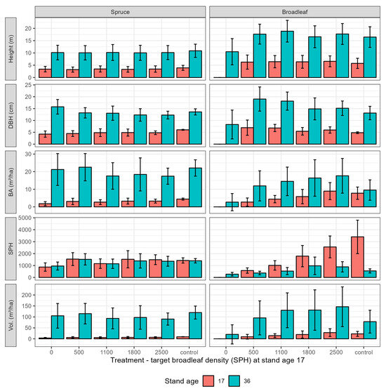 Mean tree size (height and diameter) and plot density, basal area, and total volume at stand age 17 (immediately after thinning treatment was applied in 2004) and at stand age 36 (19 years after treatment). Whiskers are standard deviations. DBH = diameter at breast height; SPH = total density (stems per hectare); BA = basal area; Vol. = total volume.