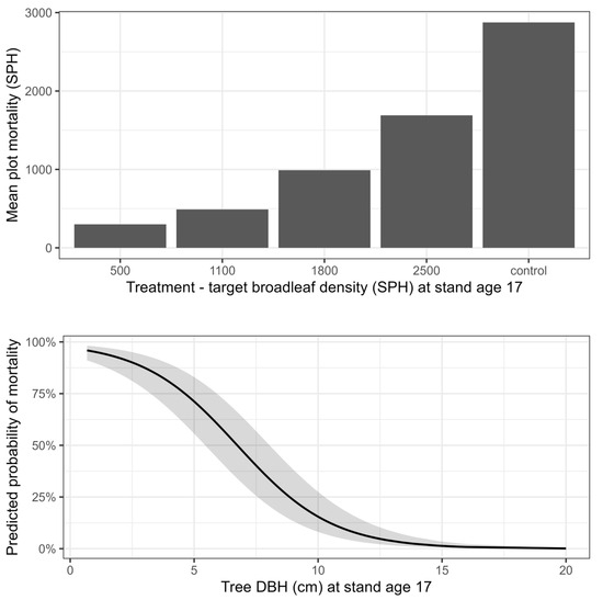 Mean broadleaf mortality (SPH) by treatment unit (top panel) and estimated probability of broadleaf individual tree mortality at age 36, by tree DBH at age 17, for reference level 500 SPH (bottom panel). Model output is reported in Table 1. Ribbon indicates 95% confidence intervals.
