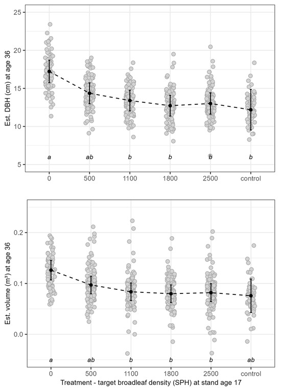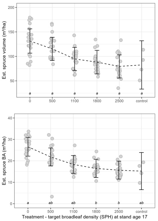 Estimated stand-level spruce volume (top) and basal area (bottom) at age 36 by broadleaf thinning treatment from models presented in Table 3. Grey dots are partial residuals from Equation (2), jittered to improve legibility. Whiskers show 95% confidence limits. Different lowercase letters indicate treatment levels with significantly different (i.e., p < 0.05, adjusted using Tukey HSD) treatment effects.