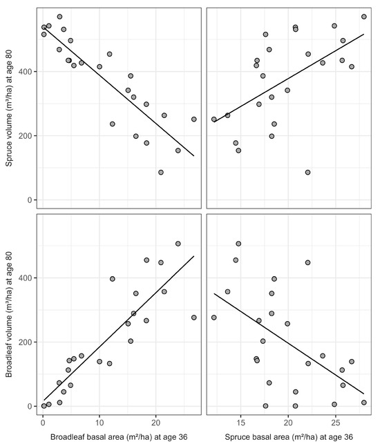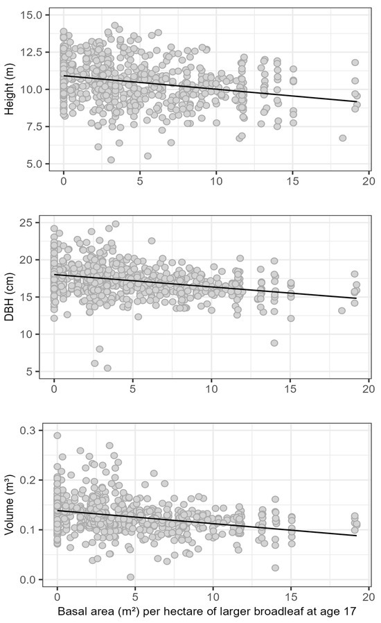 Estimated effects of taller broadleaf trees on spruce size at stand age 36. All relationships are significant (i.e., p < 0.05), and models are presented in Table 2. Grey dots are partial residuals from Equation (1).