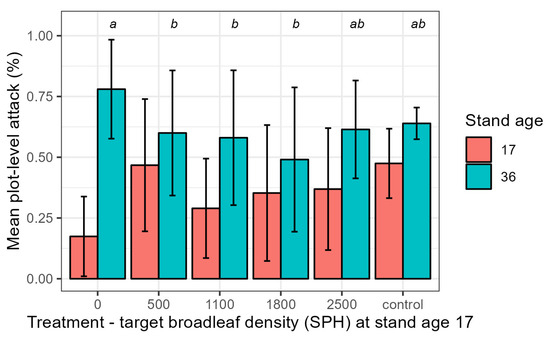 Mean plot-level percentage of spruce trees attacked by weevil at stand age 17 and 36, by thinning treatment level. Whiskers show standard deviation. Different lowercase letters indicate treatment levels with significantly different weevil attacks at stand age 36 (i.e., p < 0.05, adjusted using Tukey HSD) from models presented in Table 4.