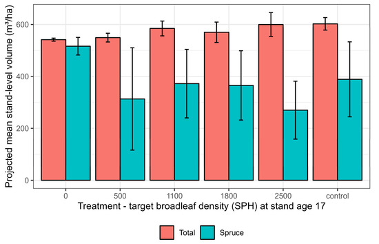 MGM21 volume projections for age 80. Projections are presented for total (all tree species) and spruce only. Bars denote mean volume projections for treatment units, and whiskers denote one standard deviation.