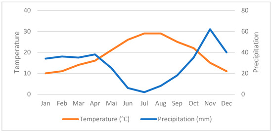 The climate of this region is semi-arid, with hot, dry summers and mild, wet winters. The data obtained from the meteorological stations in Sidi Bel-Abbes and Teghalimet indicate the average rainfall between 334 mm and 468 mm (Table 1), an average annual summer temperature of around 33.2 °C, and a winter temperature of around −9 °C [23]. A period extending from April to October is said to be a dry period, which is detrimental to the vegetation in the area. Seasonal variables are equally significant in affecting other ecological factors in the area; for example, north–northwest wind brings precipitation to the area, and southern wind causes drying of the area [19]. In a calendar year, frost occurred even, on average, around 20 days, which often impedes healthy plant growth. Frost is recorded as one of the experienced weather patterns in the area [19]. Figure 1 and Figure 2 are presented to establish a relationship between the geographical structure and the ombrothermal conditions of the Tenira forest.