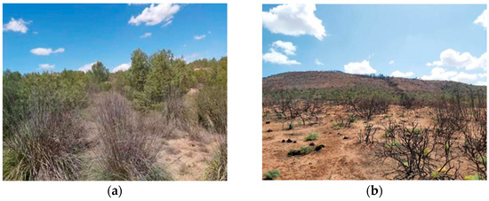 Pictures demonstrating forest fire loss in the area: (a) non-burnt area; (b) burnt area.