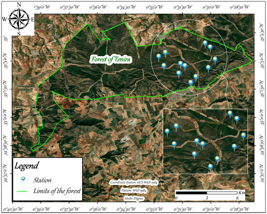 This research was conducted in Tenira forest located in Sidi Bel-Abbes Province in the northwestern region of Algeria, around 16 km south of the Sidi Bel-Abbes city. The Tenira covers a total area of 8800 hectares, with coordinates 0°33′0″ W–0°29′30″ W and 35°1′30″ N–35°4′0″ N. The study area’s geological formation stems from the Jurassic period, primarily composed of limestone and sandstone of Mrek bel Ain mountain [18]. The geomorphological aspect consists of small hills of which the average topography of the mountain is between 628 and 840 m [19]. The altitude varies from smaller slopes in the northern area (0%–10%) to the steepest slope in the southern part of the hills (>25%); thus, the spread area and speed grow as the slope rises, while the burning rate falls [20].