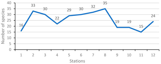The exhaustive floristic inventory carried out in the selected stations recorded 74 species (Table 3) divided into 26 families. The specie with the most occurrence was Pistacia lentiscus L. (present in 12 stations); the least occurrence was Artemisia herba-alba, Asparagus acutifolius, Asparagus albus, Brassica nigra, Calendula arvensis, Coris monspeliensis, Hedysarum spinosissimum, Neatostema apulum (L.) I.M Johnst, Linum strictum, Plantago albicans, Quercus ilex (present in 1 station). The specific richness of stations was unequal, with the highest quantity of species being in Station 8 (35 species) and the lowest in Station 01 (16 species). The average value of richness is 25 species, which, in this case, is more than moderate based on the diversity as a function of soil, light, and human intervention. Using the classification frameworks, this diversity level can be regarded as high since areas of maximum diversity known to exceed 35 are embellished with rich biodiversity [47] (Figure 6).