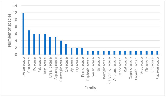 The identified species are spread over several families and are mostly dominated by the Asteraceae (16.21%) and Cistaceae (9.40%) families. Other equally important families are Poaceae, Fabaceae, and Lamiaceae (each 8.10%) plants, as well as Plantaginaceae and Oleaceae (Figure 7).