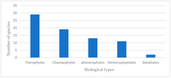 Raunkiaer’s classification demonstrates that the study area is represented in the following form of plant species: therophytes (39.19%), which appear to be dominant/most widespread; chamaephytes (25.68%); phanerophytes (17.56%); hemicryptophytes (14.86%); geophytes (2.71%) (Figure 8).