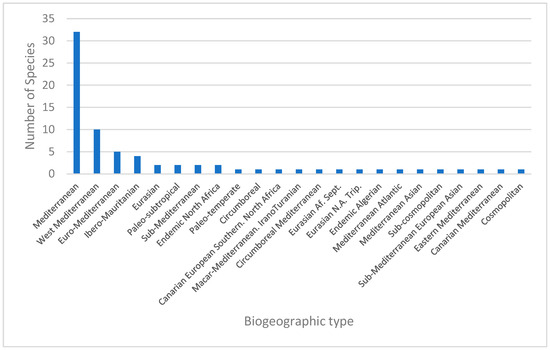 The Mediterranean element has a pronounced prevalence, comprising 32 species, which corresponds to a rate of 43.24%. Furthermore, if we consider the West Mediterranean species (10 species and a rate of 13.51%) and Euro-Mediterranean species (5 species and a rate of 6.75%), the total of Mediterranean species amounts to 47 species, which corresponds to a rate of 63.5%. The rest of the biogeographic types share low frequencies (highest 5.40% to lowest 1.35%) (Figure 9).