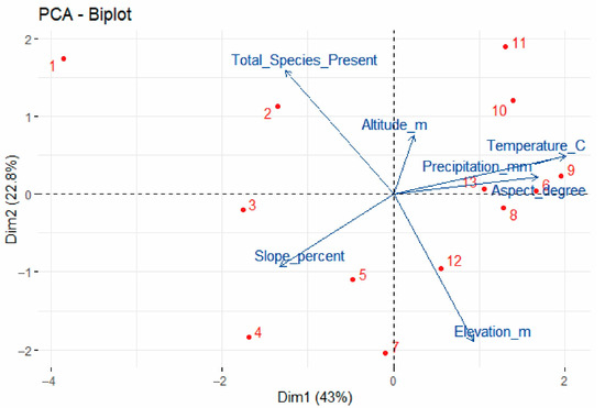This research explains the complex interactions between environmental variables and vegetation after fire recovery in the Tenira forest. The fusion of PCA and Random Forest modeling revealed that precipitation, temperature, slope, and altitude were the most important factors affecting recovery pathways, with the first principal component (PC1) alone accounting for 43% of the variance.