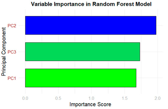 A Random Forest (RF) model was applied, where the input features were the components obtained from PCA to estimate the recovery levels (high, medium, low). Every tree in the forest participates in the classification, with the final recovery levels being the voting majority across all trees [10]. One thousand trees were used in this case with mtry = 3, which implies that at each split, three variables were drawn at random; this enhances performance and reduces overfitting [10]. Model accuracy was enhanced by using cross-validated hyperparameter tuning, which selected the best parameters for the given dataset. In terms of variable importance, mean decrease in accuracy and mean decrease in Gini index metrics were used, with PC3 and PC4 being the best predictors [11].