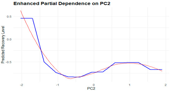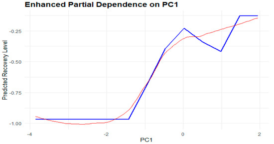 The present study attempted to create partial dependence plots for the principal components, even though it was not intended to estimate their relative marginal effects on the RF predictions. The PDP for each PC provides insight into the relationship between a given principal component and the predicted recovery level, helping to interpret the model’s decision boundaries. The analysis showed that PC4 had a significant influence on recovery predictions, while PC1 showed minimal influence [45]. Partial dependence can be formulated as follows: