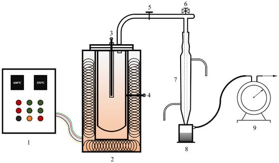 Schematic of experimental installation. 1. Temperature control system. 2. Reactor. 3. Temperature sensor in the reactor. 4. Temperature sensor outside the reactor. 5. Connectors. 6. Pressure relief valves. 7. Condensation device. 8. Collection device. 9. Wet gas flowmeter.