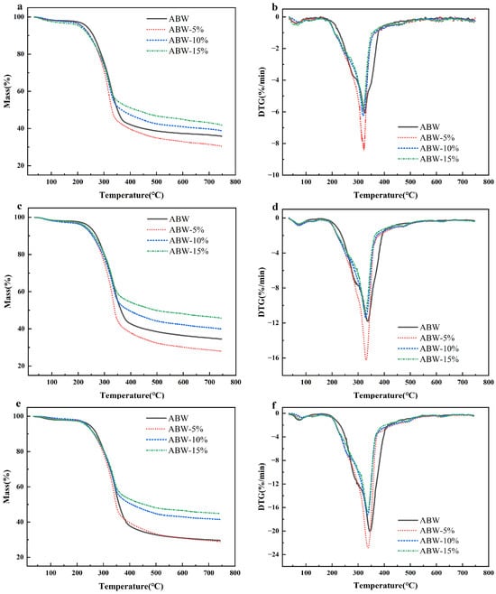 TG and DTG curves of four kinds of ABW at different heating rates: (a,b): 10 °C/min; (c,d): 20 °C/min; (e,f): 30 °C/min.
