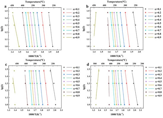 FWO model-free kinetic diagram: (a) ABW; (b) ABW-5%; (c) ABW-10%; (d) ABW-15%.