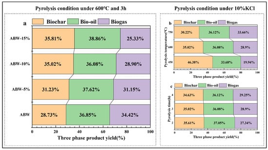 The distribution of three−phase product yield under the condition of single factor treatment of ABW: (a) different impregnation concentration; (b) different pyrolysis temperatures; (c) different pyrolysis time.