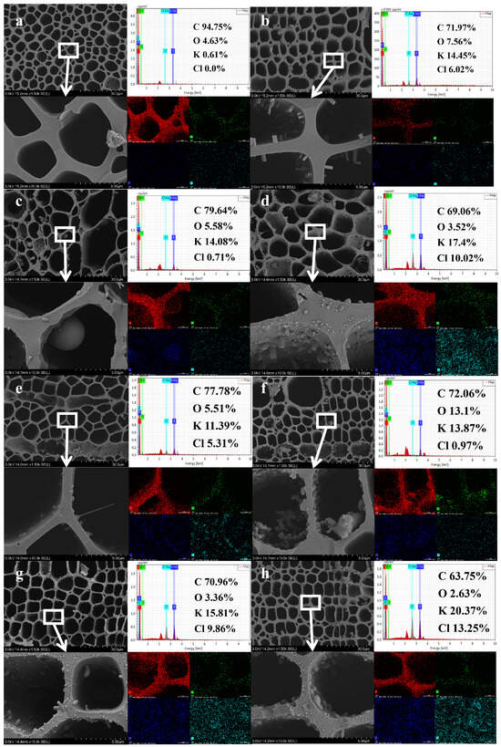 SEM-EDS was employed to investigate the surface morphological structure and the atomic distribution of C, O, K, and Cl in the biochar of both raw materials and impregnated samples. Figure 5a–h represent the SEM–EDS images of biochar under various pyrolysis conditions, showing a relatively intact structure with residual wood cell morphology.