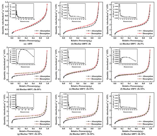The pore structure of biochar derived from ABW under different pyrolysis conditions was analyzed using the BET method. The adsorption/desorption isotherms and pore size distribution diagrams are shown in Figure 6. It can be observed that the nitrogen adsorption–desorption isotherm in Figure 6a belongs to Type I; the nitrogen adsorption–desorption isotherms in Figure 6b–i belong to Type IV. There is no distinct plateau of saturation adsorption in the isotherms, and H3-type hysteresis loops are observed, indicating the heterogeneity of the material’s pores, all of which are mesopores. At low temperatures, the majority of the biochar pore sizes are within 50 nm, showing a broader mesoporous distribution. When the temperature rises to 750 °C, some larger pores between 50 and 105 nm appear in the biochar pore sizes, possibly due to the high temperature merging adjacent small pores into larger ones, leading to an increase in pore size.
