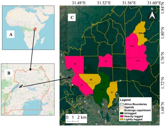 Locations of study sites and logging intensities within Budongo Forest, Uganda. (A) shows a map of Africa highlighting Uganda, (B) shows a map of Uganda with Budongo Forest indicated, and (C) presents a map of Budongo Forest displaying the locations of study sites categorized by logging intensities.