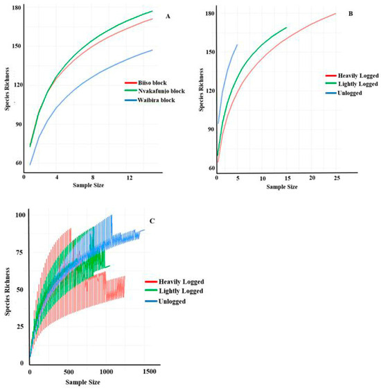 Species accumulation and rarefaction curves for the inventoried trees across different management blocks and logging intensities in Budongo Forest, Uganda. The curves (A,B) illustrate species accumulation across the management blocks and logging intensities while (C) shows the rarefaction curves for species richness, standardized to the number of plots, for heavily logged, lightly logged and unlogged forest areas. These curves help to visualize how species richness varies across the disturbance gradient and management blocks in Budongo Forest.