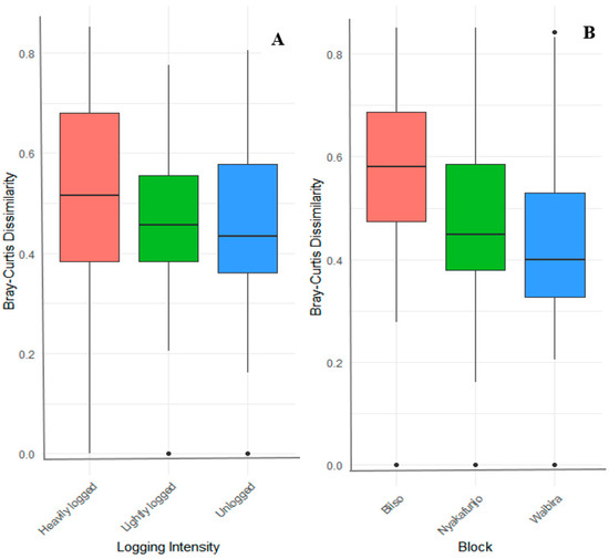 Variation in species composition as measured by Bray–Curtis dissimilarity among the following: (A) logging intensities; and (B) management blocks in Budongo rainforest, Uganda. Heavily logged had significantly higher species dissimilarity with lightly logged (R2 = 0.318; F2, 42 = 3.684; p = 0.033) and unlogged (R2 = 0.495; F2, 42 = 5.164; p = 0.018); Waibira block exhibited lower species composition compared to Nyakafunjo block (R2 = 0.216; F2, 42 = 2.586; p = 0.015) and Biiso block (R2 = 0.327; F2, 42 = 4.391; p = 0.008). Outliers in Bray-Curtis for lightly logged and unlogged forests suggest greater plot-level similarity due to localized factors. The absence of outliers in heavily logged forests is most likely due to community homogenization. While outliers in Waibira on both sides indicate high habitat heterogeneity compared to outliers on only the lower side for Biiso and Nyakafunjo, reflecting potentially shared landscap features.