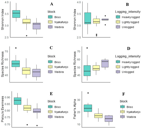 Comparison of diversity indices for trees of diameter (DBH ≥ 10 cm): (A) Shannon index for management blocks; (B) Shannon index for logging intensities; (C) species richness for management blocks; (D) species richness for logging intensities; (E) Pielou’s evenness for management blocks; and (F) Fisher’s alpha index for logging intensities in Budongo rainforest, Uganda. Shannon–Weiner index was significant between Biiso and Nyakafunjo (p = 0.002), Biiso and Waibira (p < 0.001), and not Nyakafunjo and Waibira (p = 0.196); species richness in Waibira block was significantly different compared to Nyakafunjo block (p = 0.022) and Biiso block (p = 0.001); Pielou’s evenness was significant between Biiso and Nyakafunjo (p < 0.001), Biiso and Waibira (p < 0.001), and not Nyakafunjo and Waibira (p = 0.739); and Fisher’s alpha was significant between Biiso and Nyakafunjo (p = 0.014), Biiso and Waibira (p = 0.001), but not between Nyakafunjo and Waibira (p = 0.358). The outliers suggest variability in diversity and community structure driven by differing logging intensities and ecological conditions across blocks.