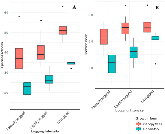 Species richness and the diversity of understory and canopy species were significantly different as revealed by ANOVA results for growth-form (F1, 84 = 166.84; p < 0.001) and logging gradient (F2, 84 = 22.25; p = 0.001). Again, the ANOVA results showed species diversity (Shannon–Wiener index) was significantly different between growth-form (F1, 84 = 141.03; p < 0.001) and among logging intensities (F2, 84 = 20.24; p = 0.001). The results of Tukey’s post-hoc HSD tests showed a significant difference in understory species richness across all logging intensities (Figure 6A). Nonetheless, for canopy trees, a significant difference in species richness was only observed between unlogged and logged forests, with no significant difference between heavily logged and lightly logged forests (Figure 6A). Again, the results for the Shannon index showed a significant difference in understory species richness across all logging intensities (Figure 6). Conversely, for canopy trees, significant differences in species diversity were observed between heavily logged and lightly logged forests and heavily logged and unlogged forests, with no significant difference between lightly logged and unlogged forests (Figure 6B).