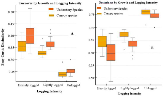 Variation in beta diversity for (A) turnover and (B) nestedness for both understory and canopy trees as measured by Bray–Curtis dissimilarity across logging intensities in Budongo rainforest, Uganda. Significant difference was observed in turnover of understory species between heavily logged and unlogged (R2 = 0.183; F2, 42 = 4.028; p = 0.009), lightly logged and unlogged (R2 = 0.192; F2, 42 = 3.551; p = 0.009), but not between heavily logged and lightly logged (R2 = 0.043; F2, 42 = 0.933; p = 0.253); also turnover for canopy species was significant between heavily logged and unlogged (R2 = 0.217; F2, 42 = 2.852; p = 0.001), lightly logged and unlogged (R2 = 0.126; F2, 42 = 2.639, p = 0.001), and heavily logged and lightly logged (R2 = 0.065; F2, 42 = 1.863, p = 0.034); while for nestedness, significant difference was observed for understory between heavily logged and unlogged (R2 = 0.2881; F2, 42 = 4.216; p = 0.002), lightly logged and unlogged (R2 = 0.097; F2, 42 = 1.952, p = 0.019), but not between heavily logged and lightly logged (R2 = 0.037; F2, 42 = 0.833, p = 0.627); Again, significant difference was observed for nestedness of canopy species between heavily logged and unlogged (R2 = 0.225; F2, 42 = 3.925, p = 0.003), lightly logged and unlogged (R2 = 0.184; F2, 42 = 3.374, p = 0.004), and heavily logged and lightly logged (R2 = 0.069; F2, 42 = 0.916, p = 0.381). Outliers in Bray–Curtis dissimilarity likely reflect ecological variability or patchy species distribution in less disturbed forests. In contrast, the absence of outliers in heavily logged forests suggests homogenized species composition, underscoring the role of lightly logged and unlogged forests in maintaining beta diversity.